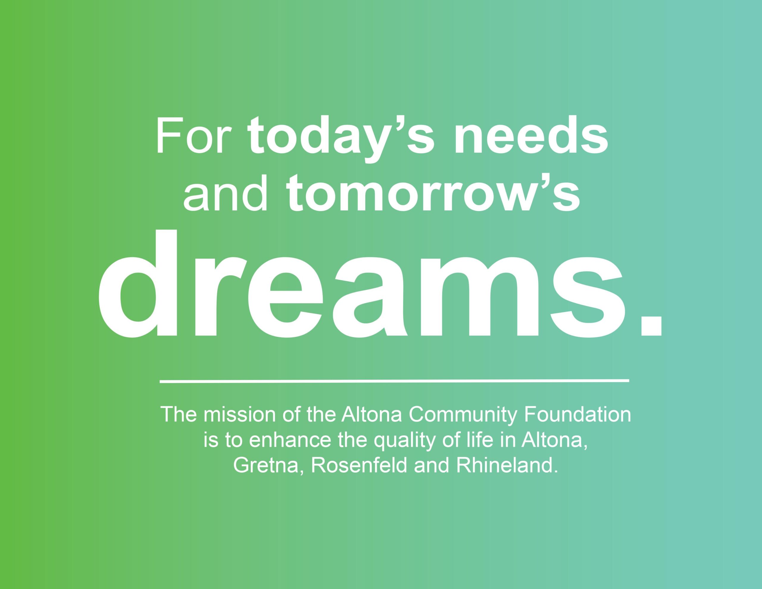 The Foundation supports projects related to youth, education, health, and community development. Two requirements needed from your organization in order to be considered are documentation and a charitable tax number. Altona Community Foundation, “For today’s needs and tomorrow’s dreams!”